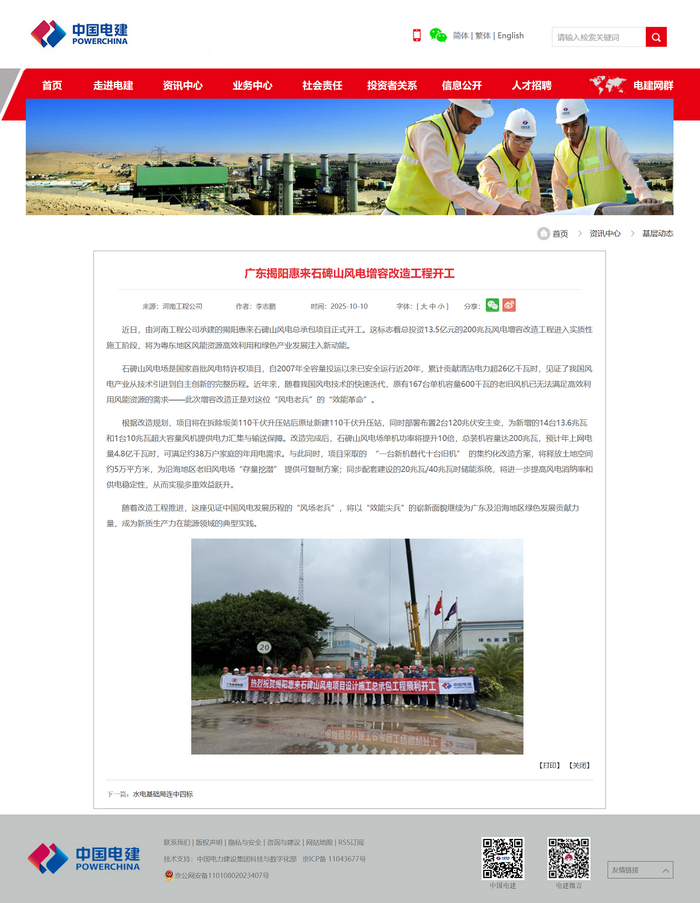 中国电建网:广东揭阳惠来石碑山风电增容改造工程开工