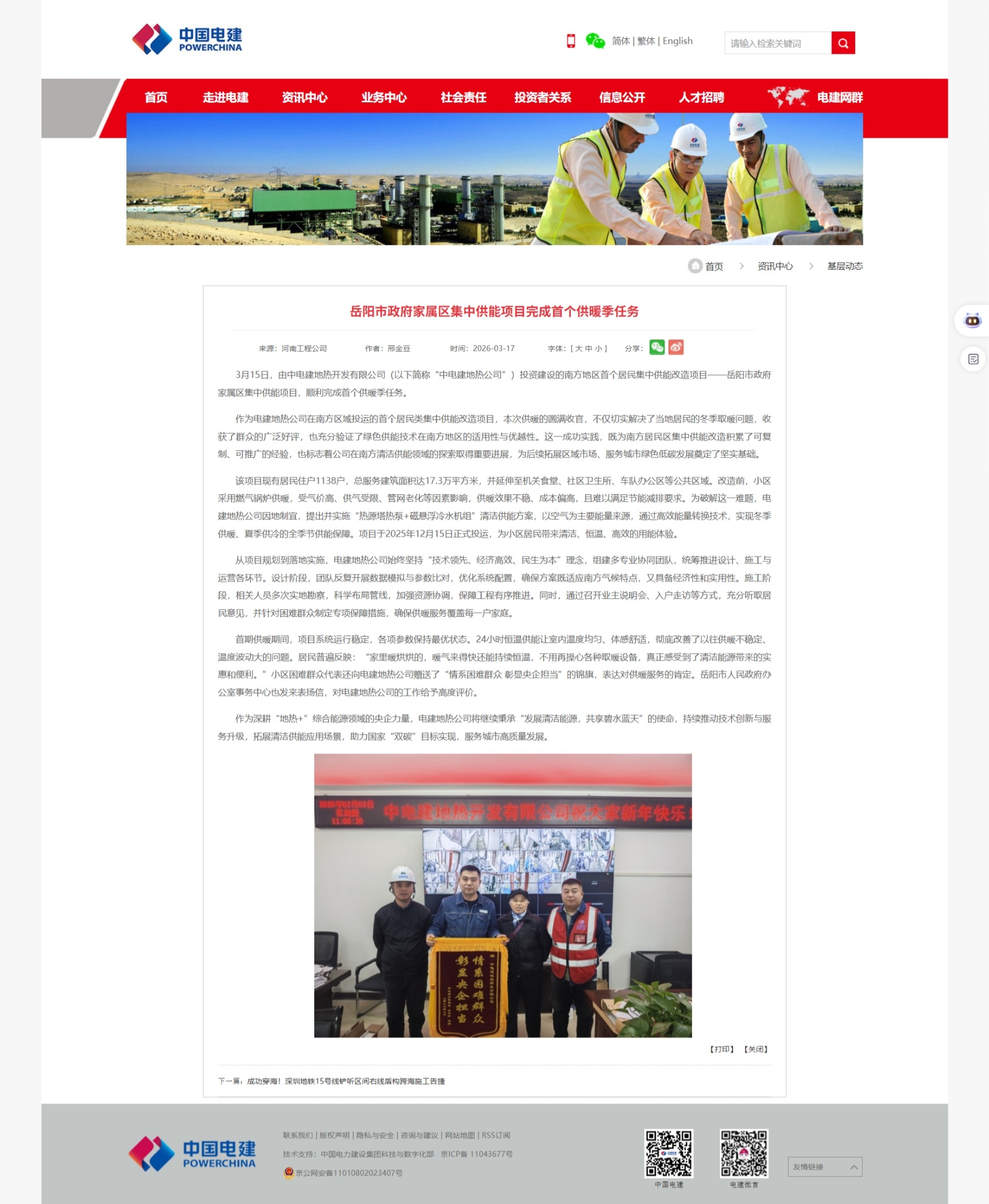 中国电建网:岳阳市政府家属区集中供能项目完成首个供暖季任务